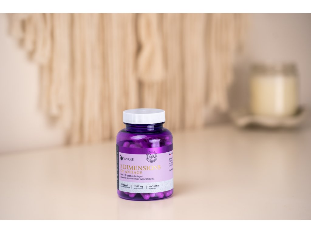 3 Dimensions of Antiage nabízí 100 % čistou bioaktivní kyselinu hyaluronovou ve farmaceutické čistotě pro vnitřní užívání o různých molekulových hmotnostech. Kombinací vysoko a nízko molekulární kyseliny hyaluronové dochází k maximální vstřebatelnosti, hydrataci pokožky, tkání a celého organismu směrem zevnitř ven. Viditelný vliv má zejména na pružnost pokožky.