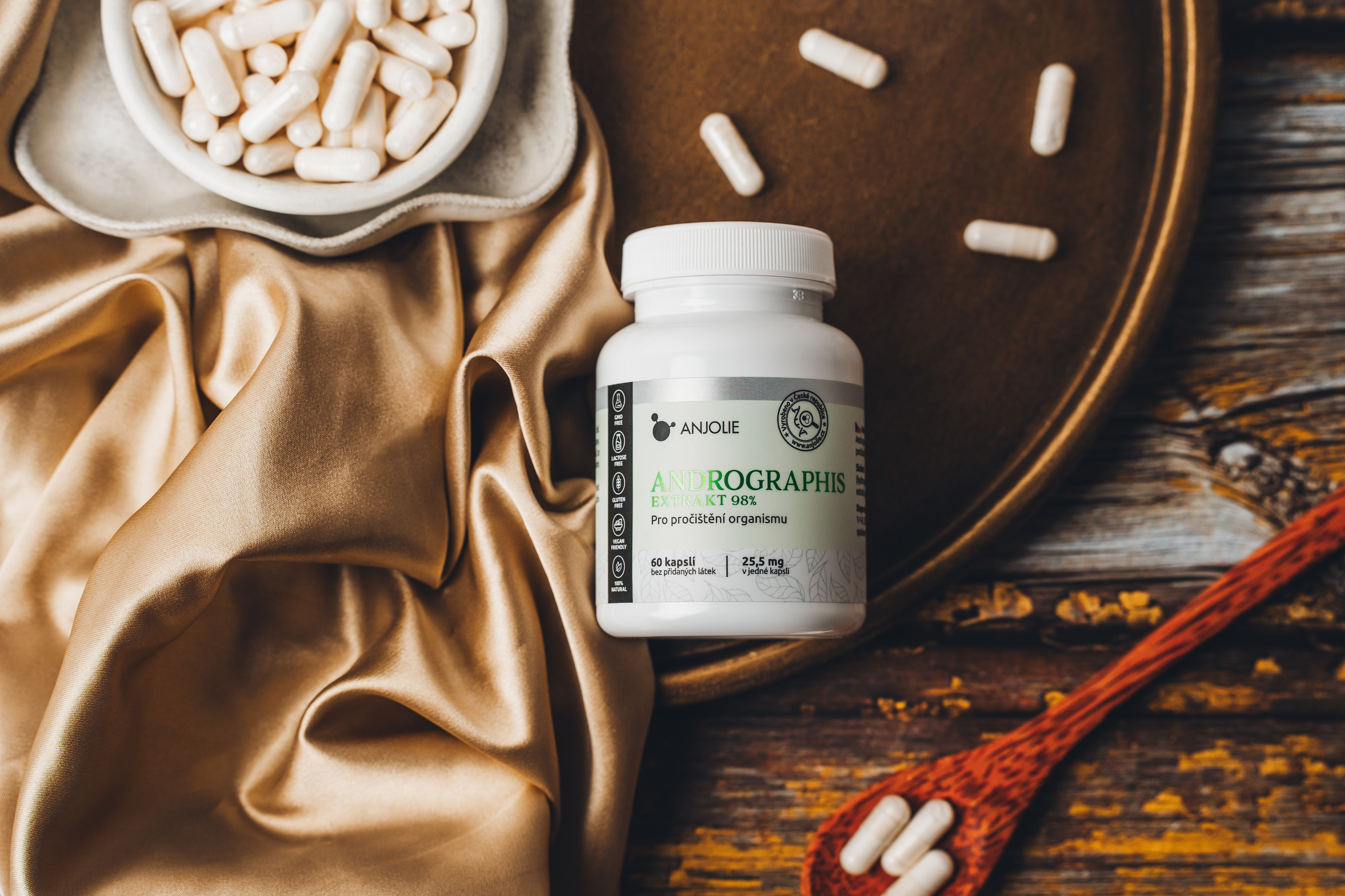 Andrographis 98 % od Anjolie je doplněk stravy pro ty, kteří už nechtějí „bylinky jen tak“. Místo sušených rostlin obsahuje vysoce koncentrovaný, standardizovaný extrakt s 98 % andrographolidů, tedy jasně definovaných rostlinných látek v každé kapsli. Každá kapsle nabízí čisté složení bez plniv,