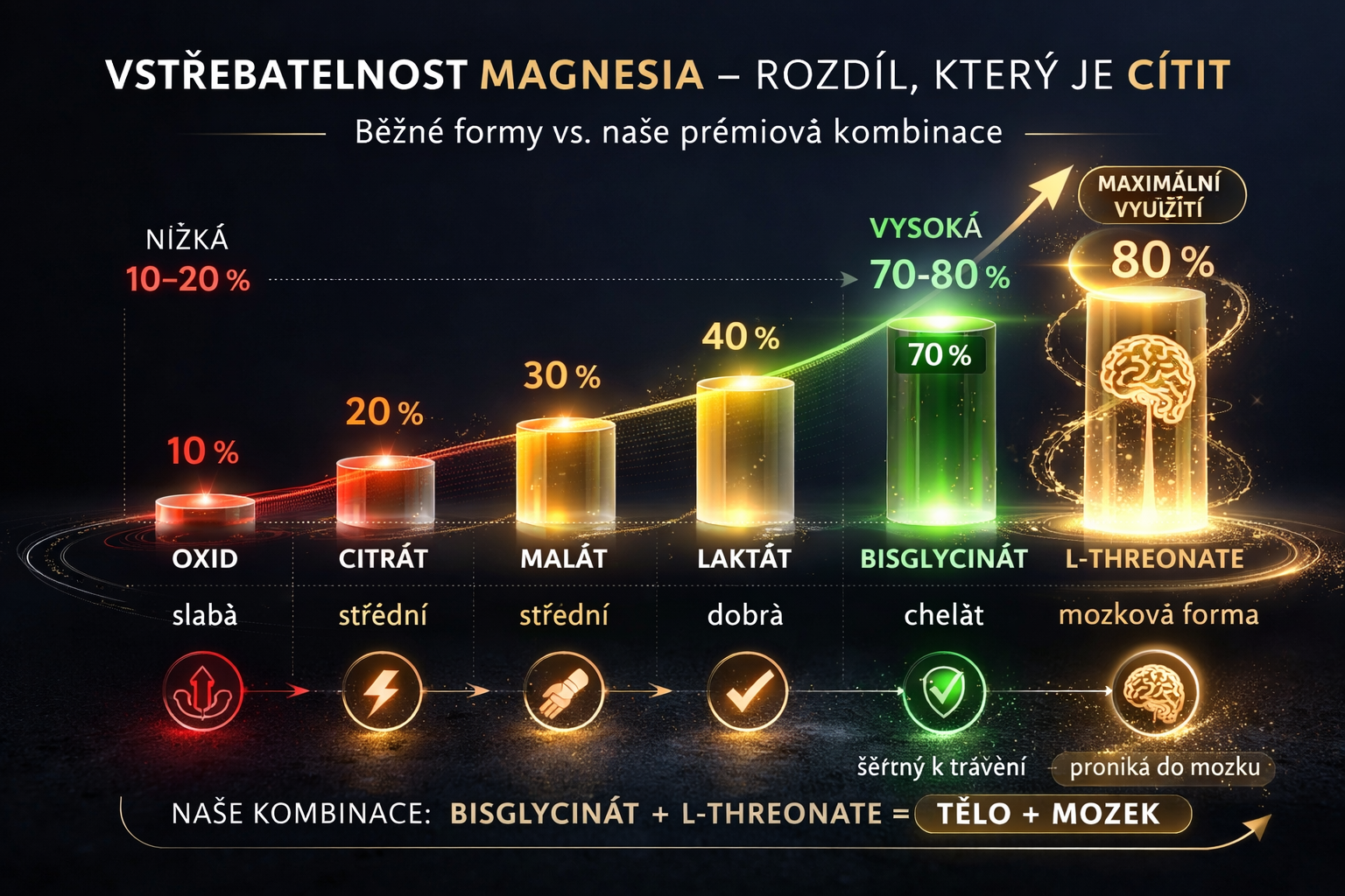 Klíčovou roli však hraje nejen množství, ale především zvolená forma. Kombinujeme vysokou dávku Magnesium L-threonate a chelátovaného bisglycinátu, aby tělo i mozek dostaly to, co skutečně využijí.