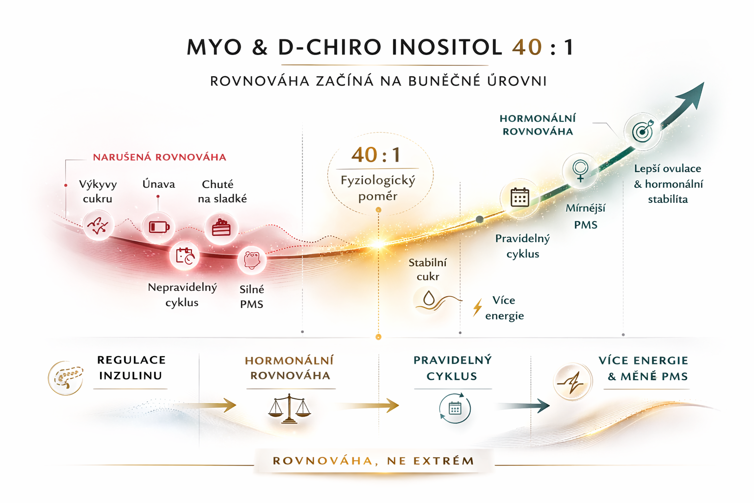 Spojujeme Myo-inositol a D-Chiro inositol v ideálním poměru 40 : 1, který odpovídá přirozenému poměru v těle. Rovnováha začíná na buněčné úrovni. Inositol je klíčová signální molekula, která ovlivňuje citlivost na inzulin i hormonální stabilitu. Když je narušená inzulinová rovnováha, často se rozkolísá i menstruační cyklus, energie a nálada.