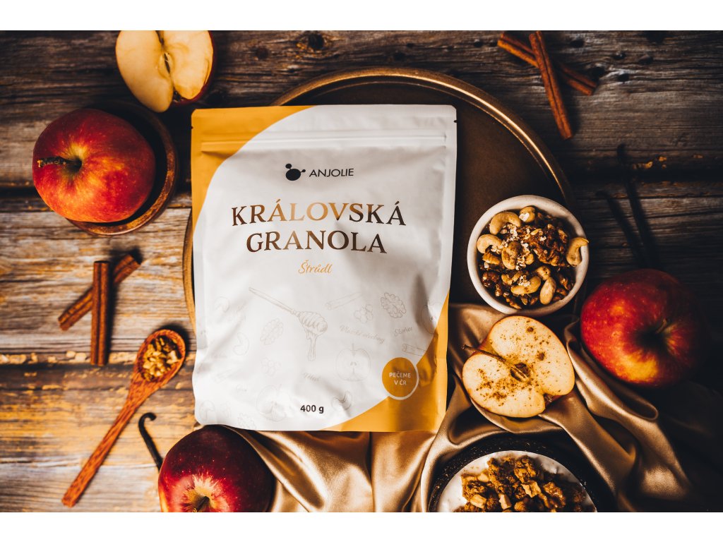 Základom sú bezlepkové ovsené vločky a vlašské orechy, ktoré pečieme pomaly a s láskou v Česku. Pre jemnosť pridávame ghee a kešu krém, vďaka ktorým má granola hebkú štruktúru a jemne maslový tón. Sušené jablkové kocky a štrúdlové korenie sa postarajú o tú pravú vôňu detstva.